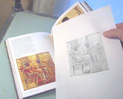 | 5. | The steel wool will take off ink from the whole picture. It will lighten up the outside and make the raised ridges shine. The piece of foil can then be wrapped around a piece of cardboard for a large panel door or wall section. Looking back, I should have picked a different photo for this example. The gray steel color just doesn't go with the Egyptian theme very well. Using India ink on foil is not my original idea. I believe it's from a school craft project that has been around for years. |