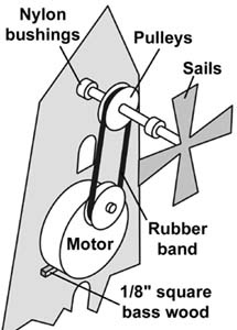 My plan that didn't workMy first idea for a motorized windmill was to put the motor down between the upper and lower windows. I wanted it positioned there just in case I wanted to add lights later on (and the motor wouldn't block the back window). Since the tower slopes, I had to put a 1/8" piece of basswood (the same used on the sails) behind the motor to tilt it straight. I used 1" diameter nylon pulleys (for patio doors) and put one on the motor and one on the sail axle. I used a rubber band as the belt so I could easily pull the belt off if I wanted to remove the sails from the windmill. However, when I turned on the motor there was a very noticeable problem. The sails would move, then stop, then move, then stop. The jerking motion was very unrealistic. The reason it didn't work is because the least amount of friction would stop the sails. As the motor turns, the rubber band would stretch until it built up enough force to turn the sails. When it had enough force built up, the sails would suddenly break free and spin a little, relieving all of the pressure in the belt. Then the sails would stop again until enough pressure built up to send it moving another few inches. It was clear to me that what I needed was either a direct gear drive or a belt that did not stretch. Since an unstretchable belt would make removing the sail difficult, I decided to go with meshing gears instead. |