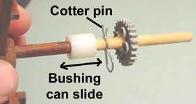 | 8. | Now with the dowel rod fully inserted into the back bushing (well, don't push it in quite all the way - you don't want it to bind up), you should now be able to tell where to glue the gear on the top shaft. Mark its position with a pencil or something, then remove the top shaft and glue the gear into place. The front nylon bushing will now be trapped between the sails and the gear. You should be able to slide the front bushing but not remove it from the axle. |