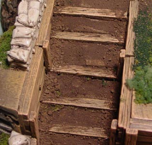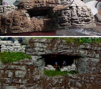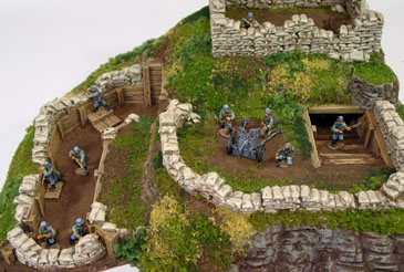 You can find complete information on how to build this model on the Sandbag Fortification Building Instructions page. Information about the sandbag mold and the trench plank molds can be found on our Tips & Tricks 32 page. The German soldiers you see here are Bolt Action figures from Warlord Games. These soldiers are 28mm in scale and measure about 1 1/4" tall. These soldiers were painted by GRG3D. |