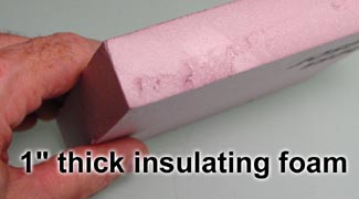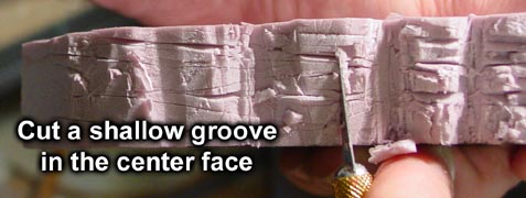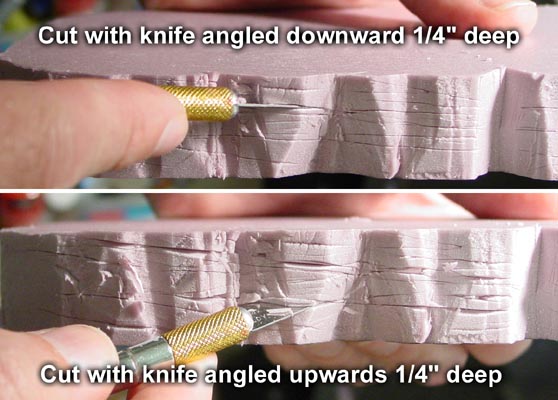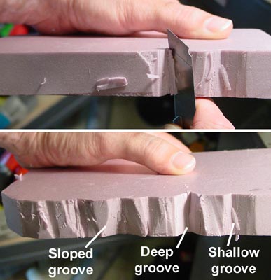 4. | Using a regular hobby knife, make horizontal cuts in the foam. Start by angling the knife downward and make several cuts about 1/4" deep. Then angle the knife upwards and make several more cuts about 1/4" deep. You would think that a lot of foam would come out of the grooves but most loose pieces seem to want to hang on. |