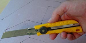 3. | Rock faces usually have two kinds of crevices, wide shallow vertical crevices and deep thin horizontal cracks. First we'll work on the shallow vertical crevices. Using the knife, cut some shallow grooves into the foam. These range from 1/4" wide to 1" wide. The depth can also be from 1/4" to 1" deep. The real trick to making it look natural is to have a variety of cuts. Make one vertical groove that is shallow and the next one fairly deep. Make one groove fairly thin and the next groove wide. Make one groove straight up and down and the next groove angle to the left. Make one groove choppy and the next one smoother. The variety of size, depth, angle and texture will give your rock face a more natural look. |