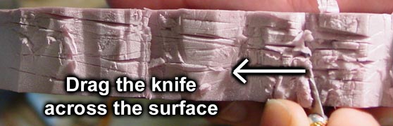 6. | While cutting these grooves, drag the knife across the surface of the foam. This will texture the front surface and pull out more bits. |