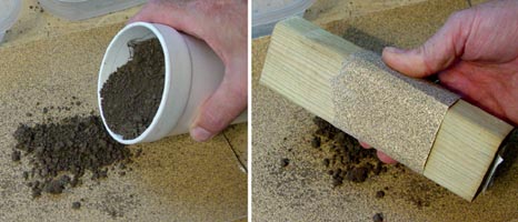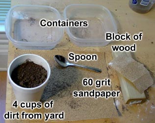 1. | I started by collecting dirt from the yard. It's better if you can get the dirt from a bank or washed out area where no grass is growing. That way you don't have to deal with a lot of grass roots. You'll need about 4 cups of dirt. Be sure that the dirt is completely dry. Otherwise the dirt will not grid down but instead just clog your sandpaper. You can spread it out on several sheets of newspaper overnight to dry it out. You will also need some containers, a spoon, some 60 grit sandpaper and a block of wood. |
