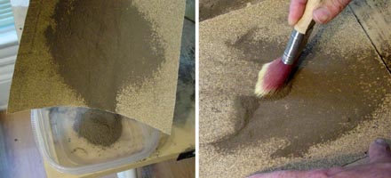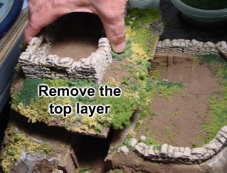 1. | Use a wide soft brush to loosen the excess dirt that you do not want. This will mostly be on the well traveled areas such as down in the trench. Also brush over the grass lightly to remove any excess just resting on the surface. Don't take off too much, just the loose stuff. The hair spray will glue down the rest. Turn the whole thing upside down and let the excess fall onto the trash bag covering the table. |