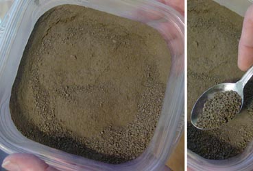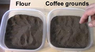 6. | When you're finally finished, you'll have two containers of dirt. One will contain fine dirt the consistency of flour. The other will contain coarse dirt the consistency of coffee grounds. For the project I'm doing, I'll need about a full cup of each. |