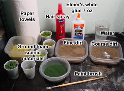 1. | When gluing on ground cover to your model, there are several things you will need. Paper towels, hair spray (pump bottle), Elmer's white glue (7oz bottle), water, fine and coarse dirt and a paint brush. For the grass and foliage, I am using Woodland Scenics ground cover. This is ground up colored foam in different colors and textures. A larger variety of color and texture will give you a more realistic looking layout. Cover your table with a trash bag. You are going to be sprinkling dirt and ground foam everywhere which will make a huge mess otherwise. |