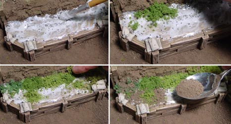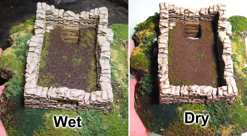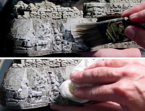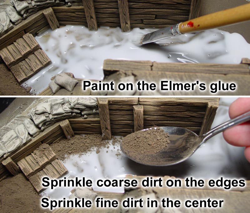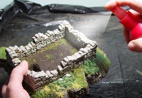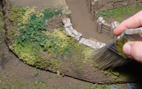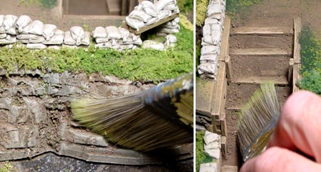 3. | Saturate the whole layout with hair spray. You might want to do this in a well ventilated area. You will notice that they dirt will turn very dark (into mud). Don't worry because it will dry a lighter color. If you don't want your sandbags to have a slight sheen to them, immediately dab the hairspray off with paper towel. Don't wipe it off or the hairspray will wipe off your paint. |