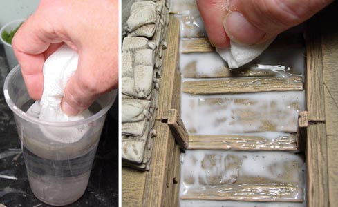 4. | There are places where I want the wooden planks to show through the dirt. To get this effect, I'm wetting down a paper towel and wiping off the glue from the surface of the planks. |