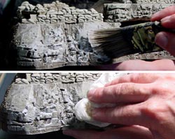 2. | If you chose of add dirt to the rock face, brush over the surface well to remove all of the dirt from the face. Wiping with a lightly damp towel is also helpful. Be sure to remove excess dirt from the plank steps and from the planks on the sandbag roof enclosure. |