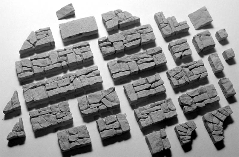 | 1. | Here is a photo of the blocks from one casting of mold#263. Click on the photo for a larger view. These blocks were made by actually breaking and assembling broken stone to form each block. Because of the deep cracks and sharp edges of the stone, these blocks have to be cast with their main surface texture face up. If I had tried to make regular full building blocks with this texture on the sides, you would have ended up with an awful amount of air bubbles in your castings. |