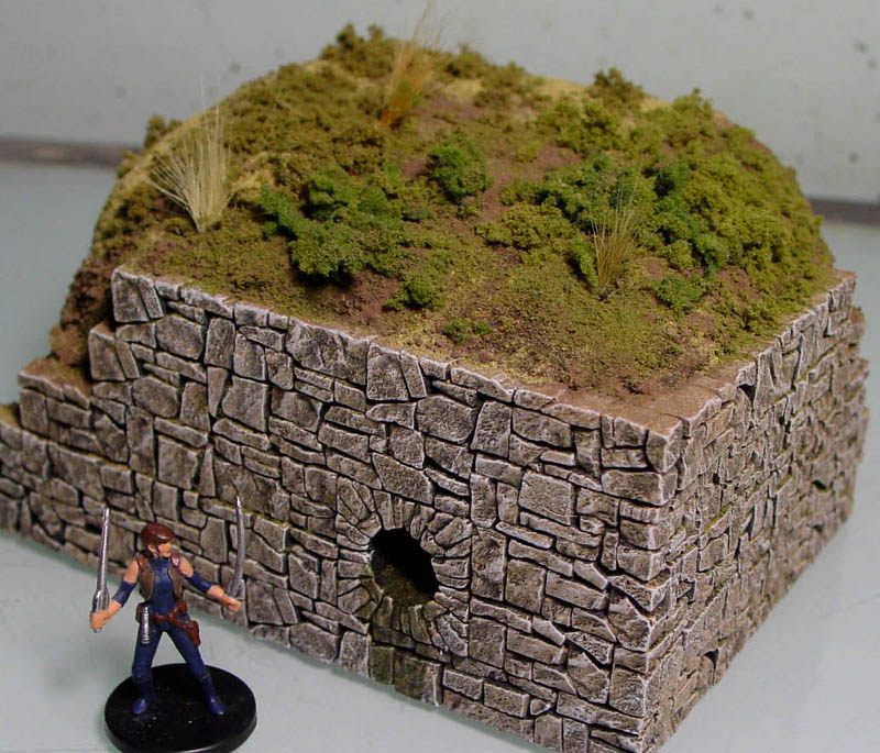 | 9. | The top foam was carved down and ground scenic materials were glued to the top surface for the grass and foliage. Painting instructions are further down on this page. Click on the photo to see a close-up of this retaining wall after painting. This method can be used to add surface texture without adding a lot of weight to the model. If you have very large surface areas, you might consider using mold #262 instead. This mold has larger wall slabs on it, so you don't have to assemble as many pieces to make a larger wall section. |