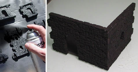 Painting the Rubble StoneFor the first coat I am spray painting it flat black. Be sure to do this outside or in a well ventilated area. Spray painting works much better because the pieces are thin and water based paint will soften the glue. The trick is to get the paint into all the cracks. To do this you will have to paint the walls straight-on, and also spray from all the angles you can think of. Paint the front and back of every piece. |
