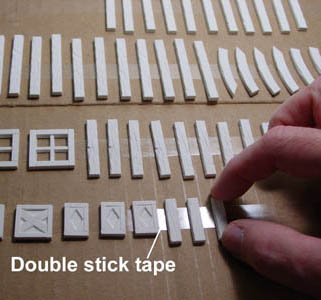 Painting the Wooden PlanksThe wooden planks used in the examples above are from mold #225. This mold not only has beams but also decorative panels and a window. At first, you may have no idea how many castings of this mold you will need. I would suggest one casting per 6" square wall section to be covered. I also suggest that you go ahead and paint every piece instead of trying to only paint what you think you will need. Before we can spray paint these black, we need to stick these down to a large piece of cardboard. I'm going to use cheap permanent double stick tape. You need the permanent kind or the pieces will not hold down. Before sticking them down, check the back of your planks. If the backs are concave, then you will need to sand the back slightly with fine sandpaper so they will stick to the cardboard properly. Simply lay a piece of fine sandpaper on a flat surface, place a plank on the sandpaper and give it a few quick swipes. This is much quicker and easier to do than you may think. Check to see if your pieces are stuck down properly by taking a wide brush and brush across them with medium pressure on the cardboard. Just pretend you are dry brushing your planks with paint. If they do not come loose from the cardboard then you know they will stay in place when you go to paint them. |