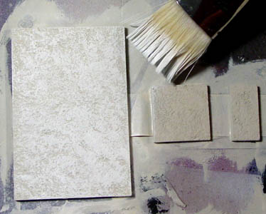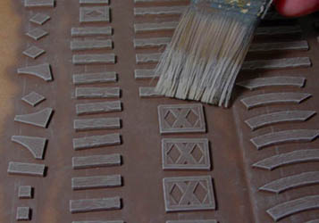 Painting the Stucco PanelsThe stucco panels used in the examples above are from mold #251. To give you some idea how many castings of this mold you will need, I would suggest one casting per 3" x 4" section of wall to be covered. I also suggest that you go ahead and paint every piece instead of trying to only paint what you think you will need. Much like the plank pieces above, I am going to stick the panels down using permanent double stick tape. If the backs of the pieces are concave, then you may need to sand them slightly so they will stick well. First, paint the stucco panel pieces the earth tone light color from the Earth Tone Painting Instructions page. This is a light cream color. You may have to thin the paint down so that it will get into all of the detail. Once dry, dry brush it solid white. |