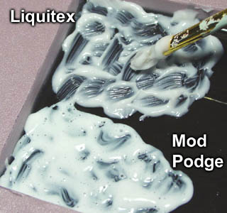 | 2. | I'm comparing the two products; Mod Podge and Liquitex Medium Gloss Gel. Both of these products are cleaned up with water, both take about 24 hours to dry and both can be used for water effects. The Mod Podge costs about $5.00 for 8 ounces and the Liquitex Gloss is about $16.00 for the same amount (as of November 2016). However, once you compare them side by side, you will see there is a big difference between how they apply to the surface. |