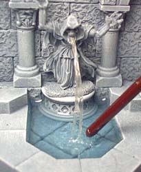 | 5. | When finished, the texture will be a nice uneven ripple pattern. I like epoxy in general because of the quick setting time, it's easy to find at your local hardware store and it's not too expensive. One note of warning though, If you are using it over fishing line to represent water pouring out of a fountain, 5 minute epoxy will turn yellow after a couple of years. However, if you're putting it on top of colored lake water, you will never see it turn yellow because it blends into the natural brown-green color of the resin below it. |