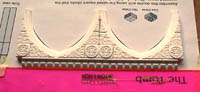 | 5. | For the large front arch, glue decorative edge onto the slanted top. Using a hobby knife, trim off the excess and miter the edges straight with the sides of the arch. Do this for the other side of the arch, and glue them together. Now glue the backside of the large arch on, but don't put decorative edge on the other side. Make two complete copies of this arch. |