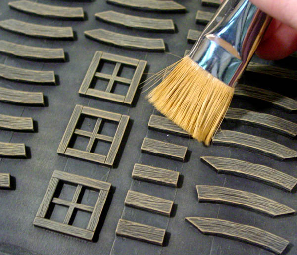 | 15. | Painting the preassembled wood pieces is very much the same as painting the planks. All pieces are spray painted flat black. Be sure that you completely spray all sides and angles on each piece. Afterwards, you will dry brush medium brown from the Earth Tone Painting Instructions page. |