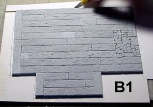 | 3. | As for painting the brick panels, you will need to start by breaking 5 vertical panels in half. You can do this by scoring it with a hobby knife and then snapping it across a sharp edge. You will also need to break one large 2" x 2" panel in half horizontally. If the broken edge is rough, sand the edge with fine sand paper. |
