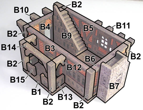 | 7. | Now, flip the house upside down to glue on the outer braces. Position the braces as you see shown in the photo. The B11 braces will not be evenly spaced apart because of the decorations on the B5 wall. |