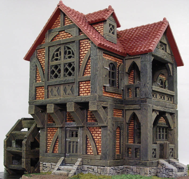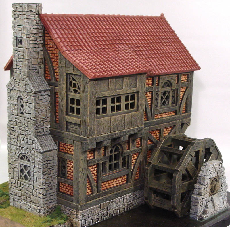To build the watermill shown here, you will need: 20 castings of mold #226 wooden beam mold. You will also need to print out the watermill building plans. The printed plans show where every block goes. The instructions below only tell you what problems to look out for when assembling the mill. This is a fairly complex project. If this is your first building project using Hirst Arts molds, I strongly suggest you choose a more simple project instead. Please follow these instructions in order. For example, glue together all of the wooden and stone sections in Step 1 before moving on to Step 2. However, you may glue together the sections within a certain step in any order you like. For example, you may glue together the wooden and stone sections in step 2 in any order. But all sections in step 2 should be completed before moving onto step 3. |
