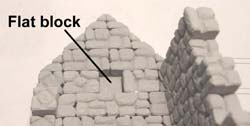 | 6. | Here is a photo of the connector blocks used to join a sloped tower into a straight wall. I've doubled them up to make a regular wall thickness. I've placed the thick block on the bottom in order for the edge of the straight wall to be staggered. This will help hide the seams when joining this into a regular straight wall. If you want these to be in a more even shape you can switch the blocks places. |